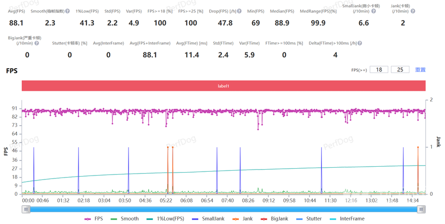 以《原神》为例,在默认高画质下,帧率选择45,开启高帧高画质中的游戏插帧功能,可以达到90帧的游戏帧率,经过PerfDog的测试,通过插帧的方式,真我GT6运行《原神》的平均帧率可以达到88.1FPS。