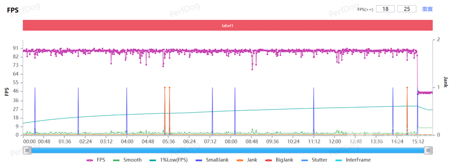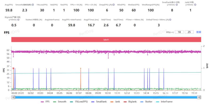 经过PerfDog的实测,真我GT6在开启超高画质与极限稳帧功能后,游戏平均帧率可以达到59.8FPS,游戏过程十分流畅。