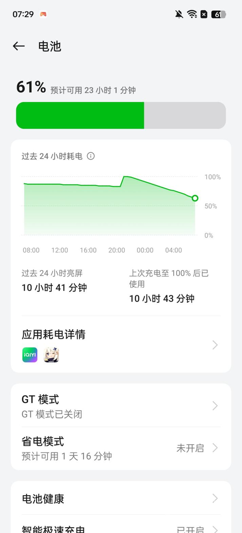 续航方面,在100%的状态下,电量设定为50%,音量设定为20%,在WiFi环境下使用爱奇艺播放1080P视频,在连续播放10小时43分钟后,手机的电量剩余61%,按照手机预估依然可以使用23小时,对于喜欢看剧的用户来说,有了真我GT6,可以一次看个够。