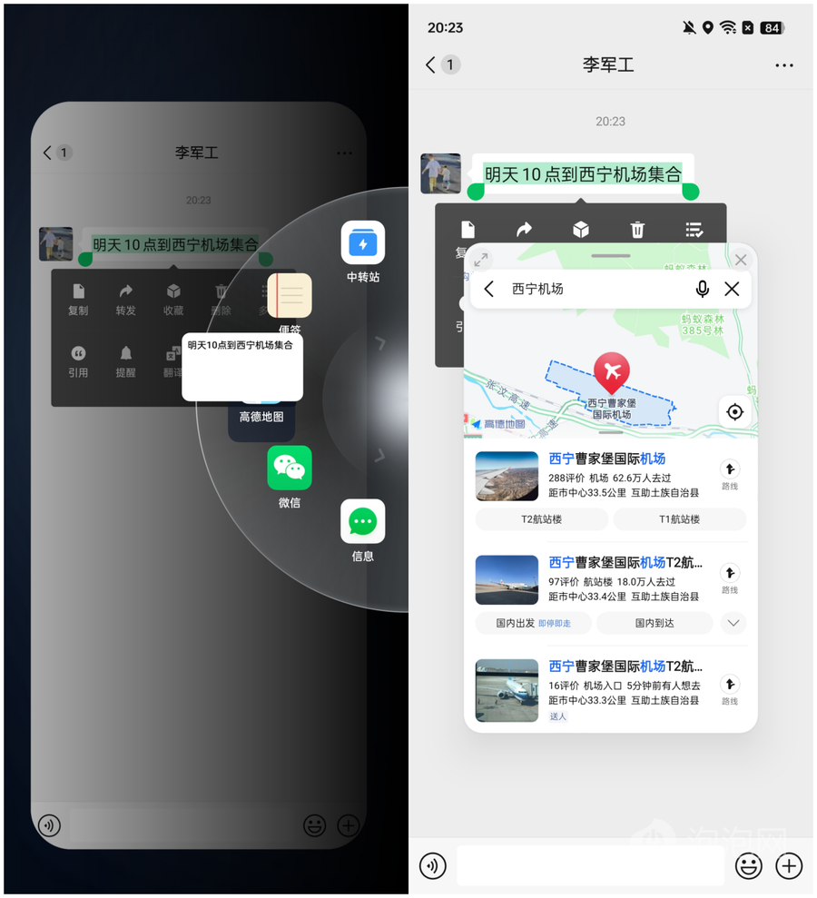 在系统层面,真我GT6也带来了AI传送门功能,它可以智能识别屏幕的内容,对用户的意图进行预测,实现高效的跨应用交互。比如当朋友在微信上发来了地址信息,那么就可以直接将地址拖动到导航APP的图标上,实现快速导航。
