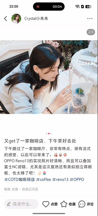 值得一提的是,Reno13的实况照片功能支持主流社交平台,除了小红书外还支持包括、抖音、微博等多达近十款APP,可以轻松上传和分享动态影像。这种全面的兼容性,解决了以往安卓手机在动态内容分享上的短板,也让实况照片在社交场景中的应用更加普及。