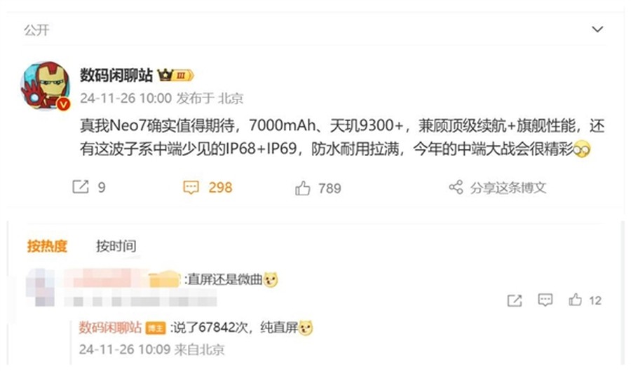 有数码博主最近爆料称,真我Neo7将搭载1.5K纯直屏,并采用联发科天玑9300+旗舰平台。这款手机的另一大亮点是内置了7000mAh的大电池,配合强劲的硬件配置,使其在性能和续航上都表现出色。此外,真我Neo7还支持IP68+IP69等级的防水防尘,进一步提升了耐用性,给用户带来更可靠的使用体验。