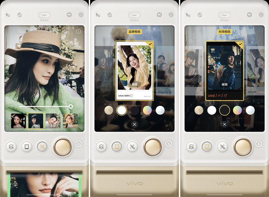 更有意思的是,vivo S20还为照片提供了个性化的多彩相纸选择。除了经典的黑白胶片,它还能根据你的拍照画面自动取色,生成一款专属的“多巴胺胶片相纸”,还有可爱的花边设计。还可以添加个性签名、自动生成时间、地点,甚至是纪念日倒计时等信息,随意调整搭配,让每张照片都更具纪念意义!