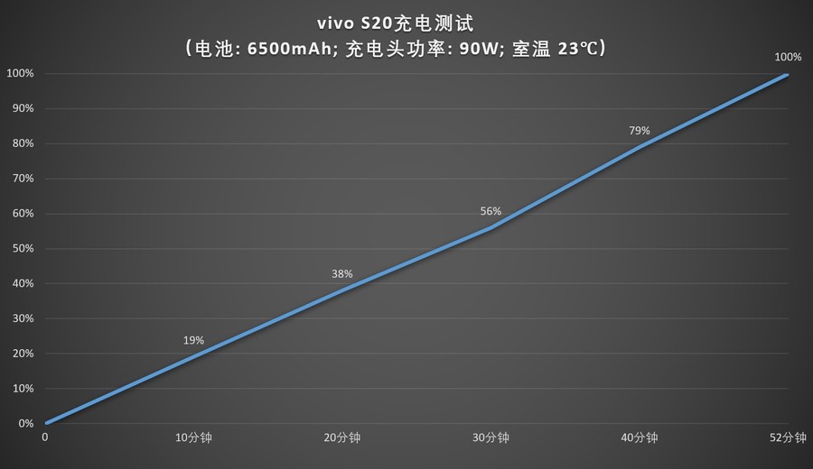 在充电方面,vivo S20支持90W超级快充,仅需10分钟即可充入近20%的电量,30分钟充至55%以上。根据我们的测试结果,6500mAh电池完全充满大约需要52分钟。而如果手机在黑屏状态下充电,充满电仅需约一个多小时。同时,这款手机还搭载的自研智慧充电引擎,可以智能识别我们的充电习惯和电池温度,并优化夜间充电时间及高温充电问题,进而降低对电池的损耗,延长使用寿命。