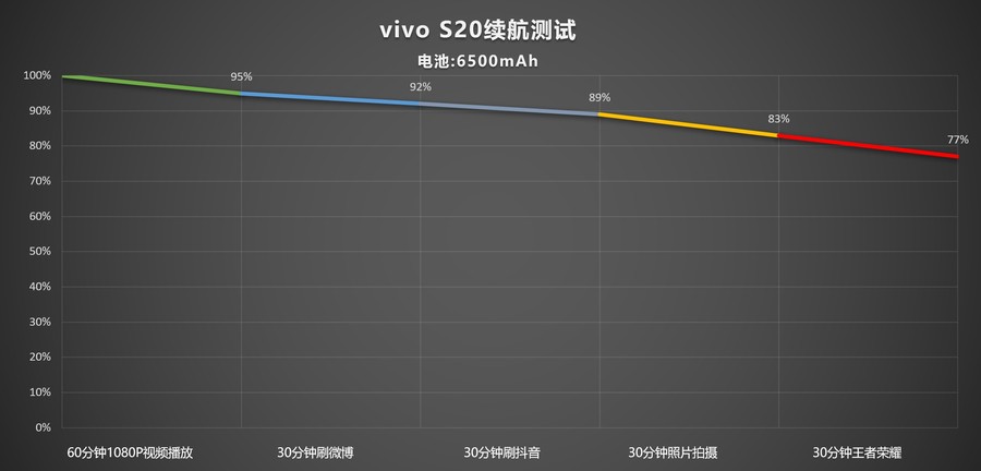 在续航表现方面,vivo S20凭借6500mAh的大容量电池,在连续使用3小时后仍保留77%的电量。这使得普通用户无需担心续航问题,甚至对于重度游戏玩家来说也无需频繁关注电量。而在浏览网页、刷微博等低负载环境下,这款手机每小时的电量消耗还不到10%,表现相当可靠。