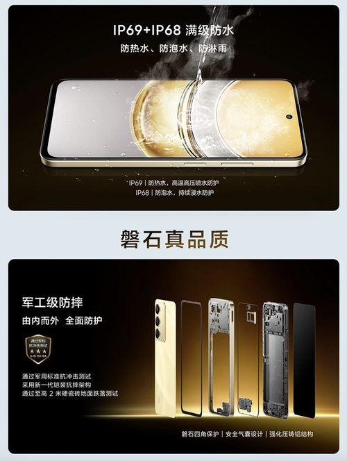 除了防水性能外,真我V60 Pro还具备军工级防摔能力。该机通过了军用标准抗冲击测试,采用了新一代铠装抗摔架构,能够承受从至高2米硬瓷砖地面跌落的冲击。这一设计,让真我V60 Pro在耐用性方面同样表现出色。