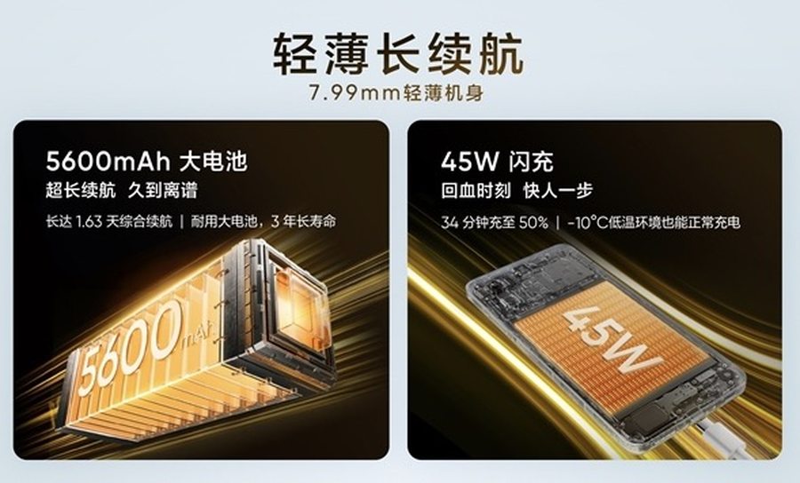 在续航方面,真我V60 Pro配备了5600mAh的大容量电池,并支持45W闪充技术。这一组合确保了手机能够持久续航,仅需34分钟即可将电量充至50%。同时,该机还保持了轻薄的机身设计,厚度仅为7.99mm,重量为197g,兼顾了便携性与实用性。