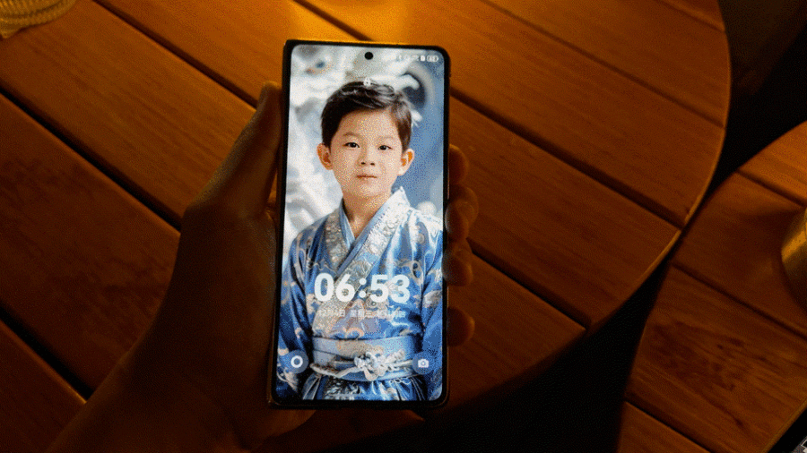 时空穿越功能可以让用户自己上传照片,通过AI图像处理,生成不同风格、不同背景下的AI人像照片,每次点亮手机时看到的形象都是不一样的,有一种穿越时空的感觉。而且这一功能并不是单纯地换脸换背景,而是基于AI对人物姿态、表情和环境光影进行针对性适配,看起来更加真实自然。