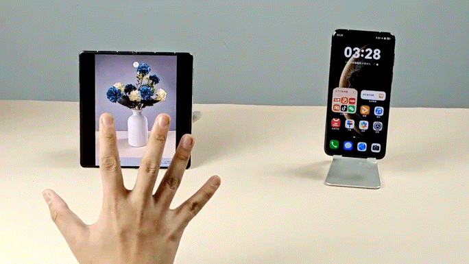 但最吸引人的还是AI隔空传送功能,最近在各大社交平台上也非常火,当需要给另一台鸿蒙设备传输照片时,只需要对着屏幕做出抓取的动作,再到另一台设备面前做出释放的动作,照片就能实现隔空传送,就像科幻片中的场景一般。而且两台设备无需登陆同一华为账号,也不需要在同一WiFi网络下,也不需要进行配对,只需要动动手就能实现,既方便,又好玩,在聚会的时候给朋友们秀一把,一定会成为现场最亮眼的存在。