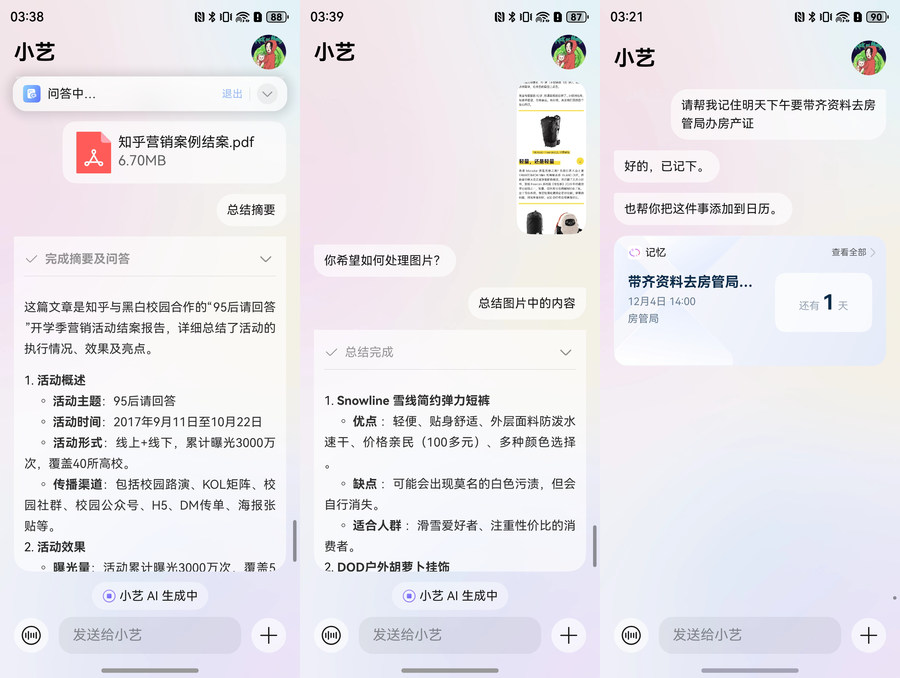 小艺还可以对文件、图片进行分析,并总结归纳相关内容。还可以根据用户的需求来创建日程。