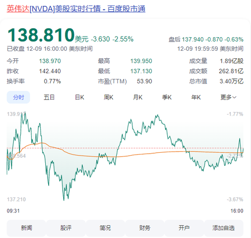 这一消息引发了市场震荡,英伟达股价在12月9日周一开盘后一度下跌3.7%,最 低触及137.13美元。投资者对调查可能带来的影响表现出明显担忧,导致股价短期内遭遇较大压力。
