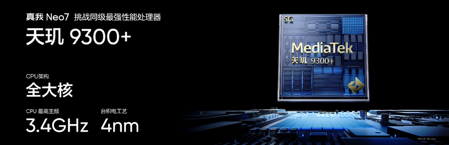 真我Neo7搭载价位段最强处理器——天玑9300+。得益于天玑9300+的全大核CPU架构、3.4GHz主频以及4nm工艺三大优势,使得真我Neo7在重负载游戏下能获得更出色、更高能效比的电竞体验。在旗舰性能基础上,真我Neo7更是全面优化性能调度、散热系统以及信号表现,打造久玩不掉帧、久玩不烫手、弱网不掉线的游戏神机。