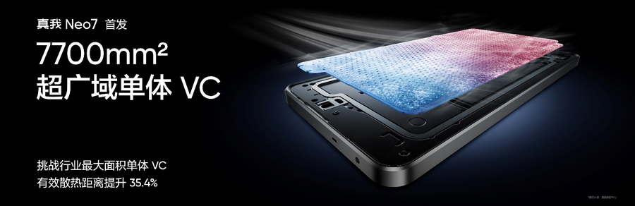 为打造久玩不烫手的游戏体验,真我Neo7全面优化散热系统,首发大气流冷锋散热系统,散热VC覆盖面积高达7700mm²,占手机整体投影面积70%,热源距离VC边缘达到了102.5mm,有效降低核心热源的温度。此外,7700mm²超广域单体VC气腔高度相比上一代提升50%,蓄水量提升15%,让内部冷凝水汽高效发挥对流作用,犹如冷风过境一般带走热量。