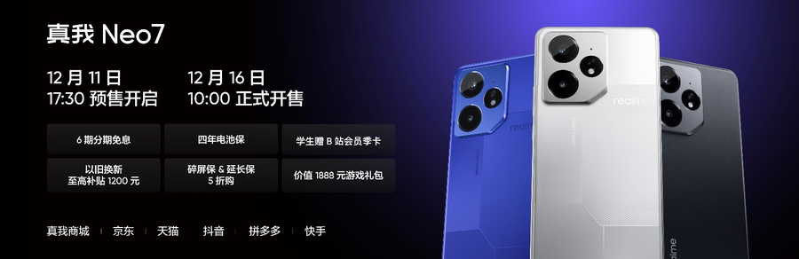 真我Neo7将于12月11日17:30开启预售,12月16日正式全渠道开售。用户还可享受6期免息、4年电池保、至高1200元的以旧换新补贴、5折购碎屏保与延长保等福利,学生用户还会加赠B站会员季卡。此外,真我老用户以旧换新可享100元额外补贴,真我Neo系列老用户可享200元额外补贴。