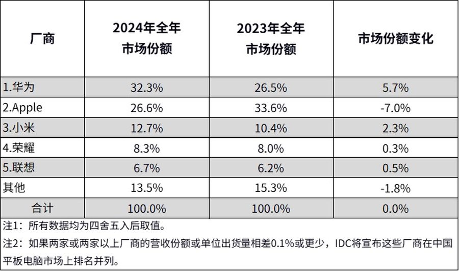 国际数据公司IDC发布《2024年第四季度中国平板电脑市场季度跟踪报告》,2024年全年平板电脑出货量达到2985万台,同比增长4.3%,整体数据处于回暖状态。其中,华为延续季度市场第 一名佳绩的同时,华为商用平板在2024也是拿下了市场份额第 一的成绩。