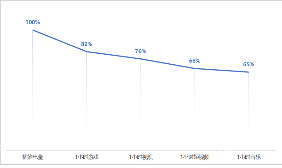 我们将整个续航测试以图表的方式来呈现可以看到,在模拟重度4小时使用之后,手机的电量从100%下降至65%。从测试情况来看,OPPO Find X8s在正常使用的情况下,是可以达到8小时以上的,足够满足用户日常的使用,做到一天一充。