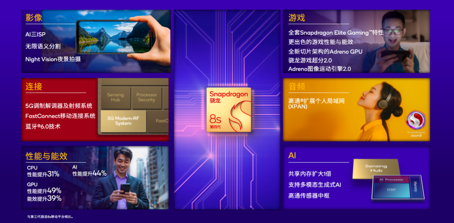 若预算有限,搭载第四代骁龙8s的机型则是性价比之选。它采用了台积电4nm工艺制程与“1超7大”的全大核架构,由一颗Cortex-X4@3.21Hz核心、3颗Cortex-A720@3.01GHz核心、2颗Cortex-A720@2.8GHz核心以及2颗Cortex-A720 2.01GHz核心组成。在提升性能的同时还进一步优化了功耗表现。GPU方面,第四代骁龙8s移动平台采用了骁龙8至尊版同代的Adreno 800系列,同样是最新的切片架构,图形性能同样不容小觑,并且同样支持全套Snapdragon Elite Gaming特性。