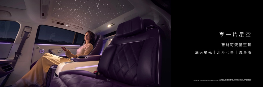 尊界S800座舱首发智能可变星空顶,呈现满天星光、北斗七星与流星雨特效。独创智能追光系统,追光灯分区布局点亮仪式感。全域环绕氛围灯隐藏式光源与内饰主题光色同韵,细腻光效如流动星空。前风挡采用三层纳米镀银技术,紫外线阻隔率大于99%。为用户带来前所未有的惬意体验。