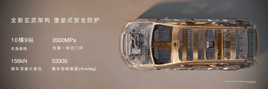 尊界S800采用全新玄武车身架构设计,1500MPa+热成型钢占比超24%、超高强钢与铝含量占比超92%,采用中汽中心C-NCAP五星标准与中保研C-IASI 3G+标准设计。10横9纵车身架构,2000MPa加强一体门环,侧车顶最大承压达16吨,整车扭转刚度达53300N·m/deg。一体化铝合金压铸工艺、3宫格后防撞梁与铝合金吸能结构,防撞能力5倍于国标。全车13气囊超高配置,四重门锁机制含ADS联动解锁,从结构源头筑牢被动防护屏障。