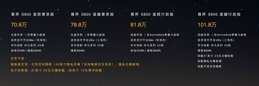 尊界S800官方建议零售价:尊界S800星辉尊享版70.8万元起,尊界S800星耀尊享版78.8万元起;尊界S800星辉行政版81.8万元起;尊界S800星耀行政版101.8万元起。全系可选智能星空顶、可变空间隔断(40英寸隐私巨幕、后排智能交互系统)、隐私光幕玻璃、电子后视镜、21英寸25孔日耀轮毂、20英寸12孔晖月轮毂。尊界S800首销期即刻下定,预订权益可叠加。赠送价值30000元华为ADS智能辅助驾驶系统高阶包权益;赠送价值至高30000元选配金权益;赠送随车尊享精品套装;赠送价值4000元智能辅助驾驶无忧服务权益;鸿蒙智行用户换购或增购可享40000元尾款减免权益;尊界S800先行者计划,6月26日开始交付,限量599台。8月中旬开始规模批量交付。