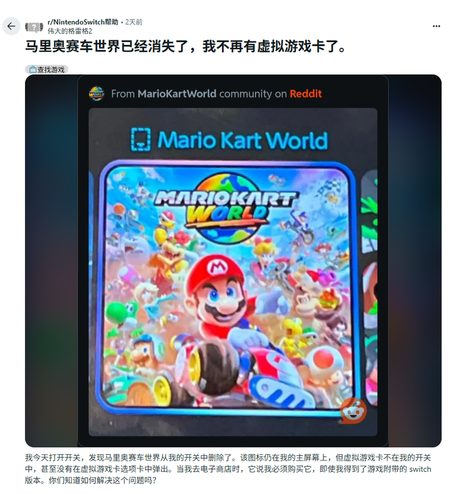 这件事最早由 Reddit 网友 u/GreatGreg2 引发热议。他将自己的 Switch 2 退换新机后,惊讶地发现原本已兑换入库的《马力欧卡丁车:世界》出现了 “虚拟游戏卡不可用” 的错误提示。主屏幕上虽然还保留着游戏图标,但尝试启动或从 eShop 重下时,系统却无情地提示他需要重新购买!这款本该属于自己的游戏,仿佛随旧主机一起 “消失了”。