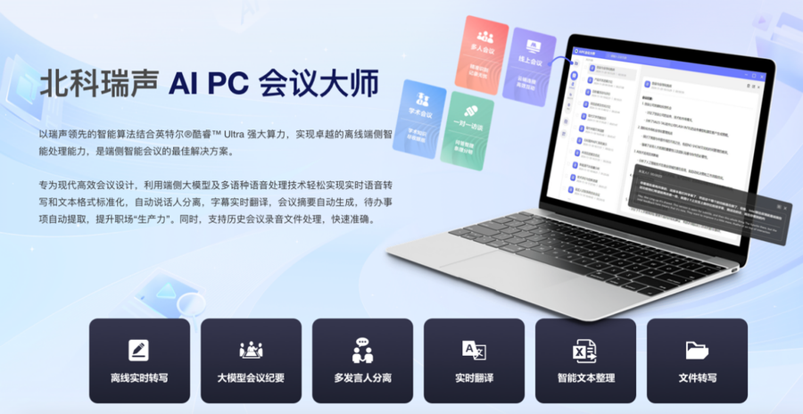 对于需要频繁处理多语言会议的商务人士,北科瑞声的AI PC会议大师就在酷睿Ultra平台展现出了惊人效率。不仅可以实现离线实时转写,还可以识别多发言人,还有针对与海外客户的沟通的实时翻译功能。并且能够依托于大模型快速生成会议纪要。更关键的是,所有数据处理均在本地完成,避免敏感商务信息上传云端的风险。