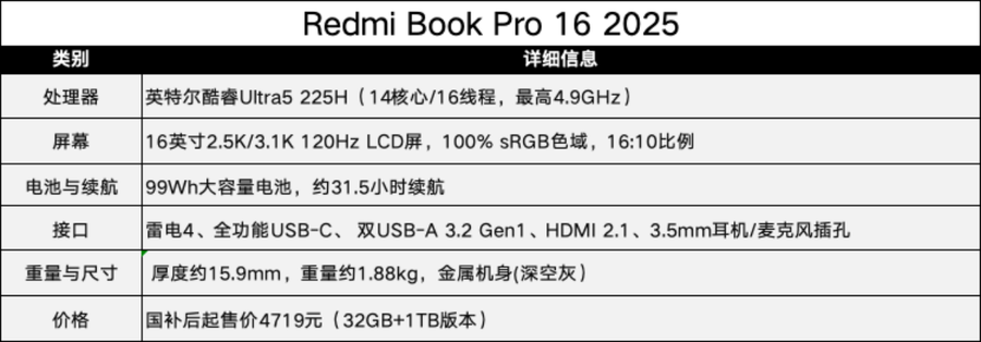 Redmi Book Pro 16 2025采用了富有质感的深空灰金属机身,厚度控制在15.9mm,首批搭载英特尔全新酷睿处理器(可选Ultra 5 225H或Ultra 7 255H型号),通过AI算力智能调度实现突破性的19.05小时超长续航体验。
