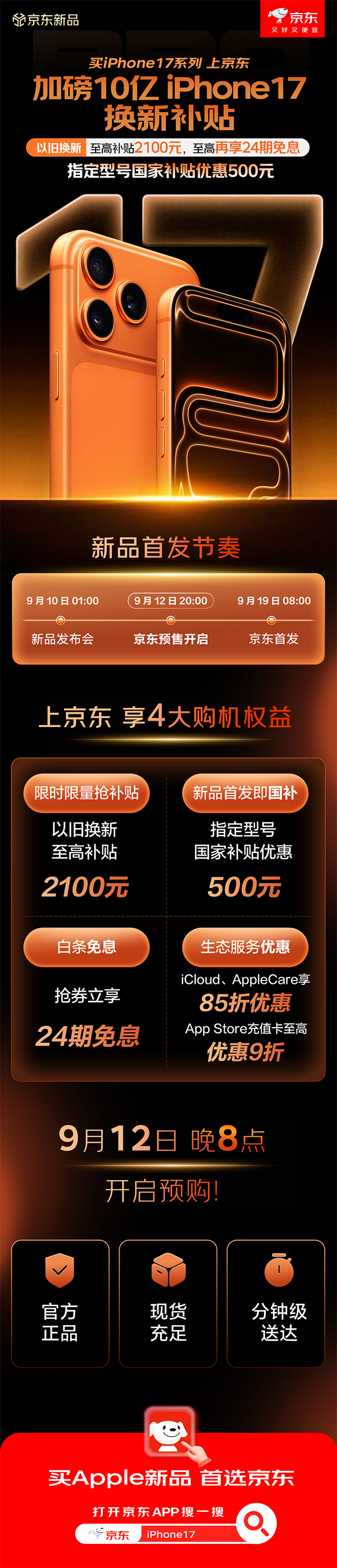 北京时间9月10日凌晨,Apple如期举办秋季新品发布会,重磅推出iPhone 17系列、新款Apple Watch及AirPods等多款新品。备受期待的iPhone 17系列将于9月12日20点开启预购,9月19日正式开售。目前,Apple产品京东自营旗舰店已同步开启预约通道,并加码10亿iPhone 17换新补贴,帮助用户以更优价格入手正品好货,只需打开京东搜索“苹果新品福利”即可。通过京东购买iPhone 17系列新品的果粉,可享受以旧换新至高补贴2100元、指定型号国补优惠500元、至高24期免息等权益,更有下单iCloud、AppleCare享85折、App Store充值卡至高优惠9折等丰富权益,让换新更轻松、更划算!此外来京东购Apple新品,可享分钟级送达。对于想快速入手iPhone 17系列新品的果粉,可以在全国Apple授权的近万家专营门店,通过京东秒送购买Apple新品,先人一步到手新机。