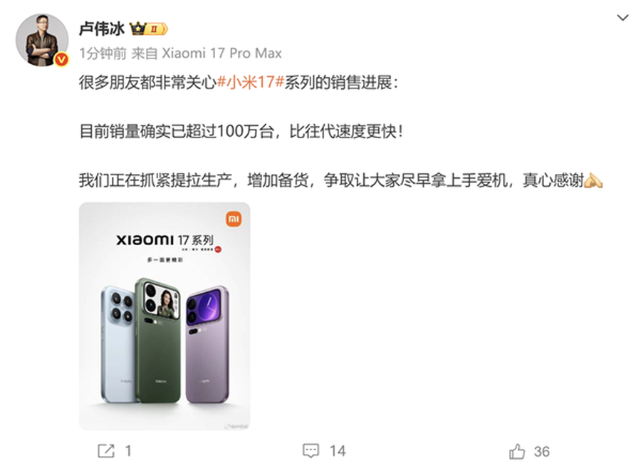 近日,小米合伙人卢伟冰发文确认,小米17系列的销量已经突破100万台,比往年更为迅速。他表示,尽管需求量大,但小米正在加紧生产,以增加备货,尽早满足消费者的需求。小米17系列自上市以来供不应求,部分版本已出现缺货现象,许多消费者线上线下都跑了好几家店,热门版本仍然买不到。