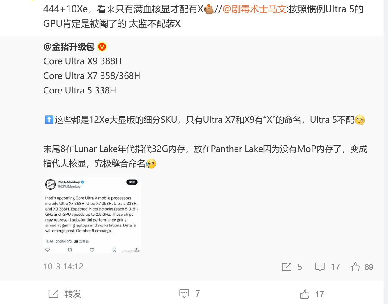 作为对比,一同曝光的还有一款酷睿Ultra 5 338H,其核显规模将有所缩减,并非满血版本。此外,型号命名中结尾的“8”引发了关注。在酷睿Ultra 200V系列(Lunar Lake)中,“8”代表封装了32GB内存,但Panther Lake并未采用此类封装设计。因此,这个数字是新一代家族的通用结尾,还是另有新含义,目前仍是一个悬念。