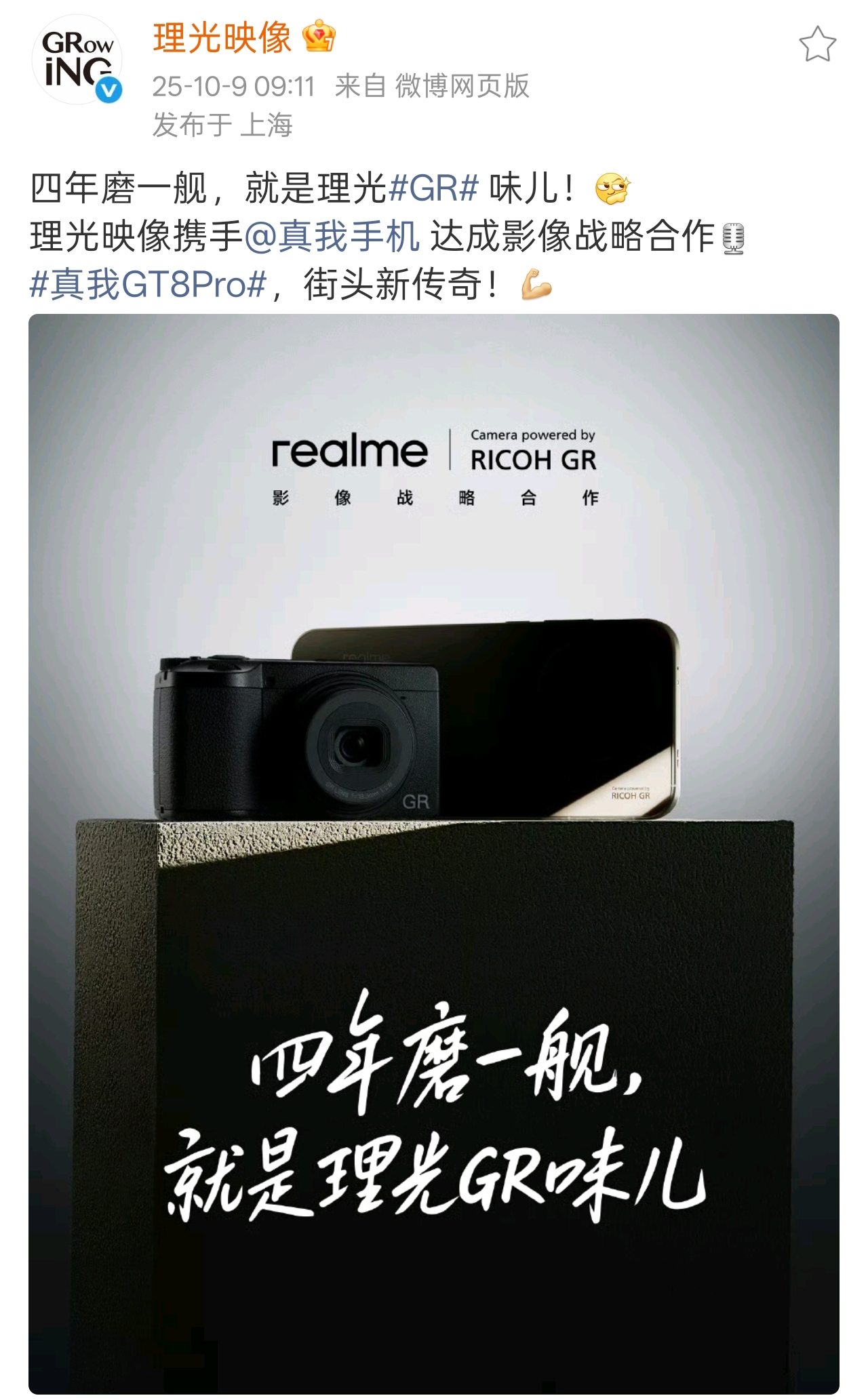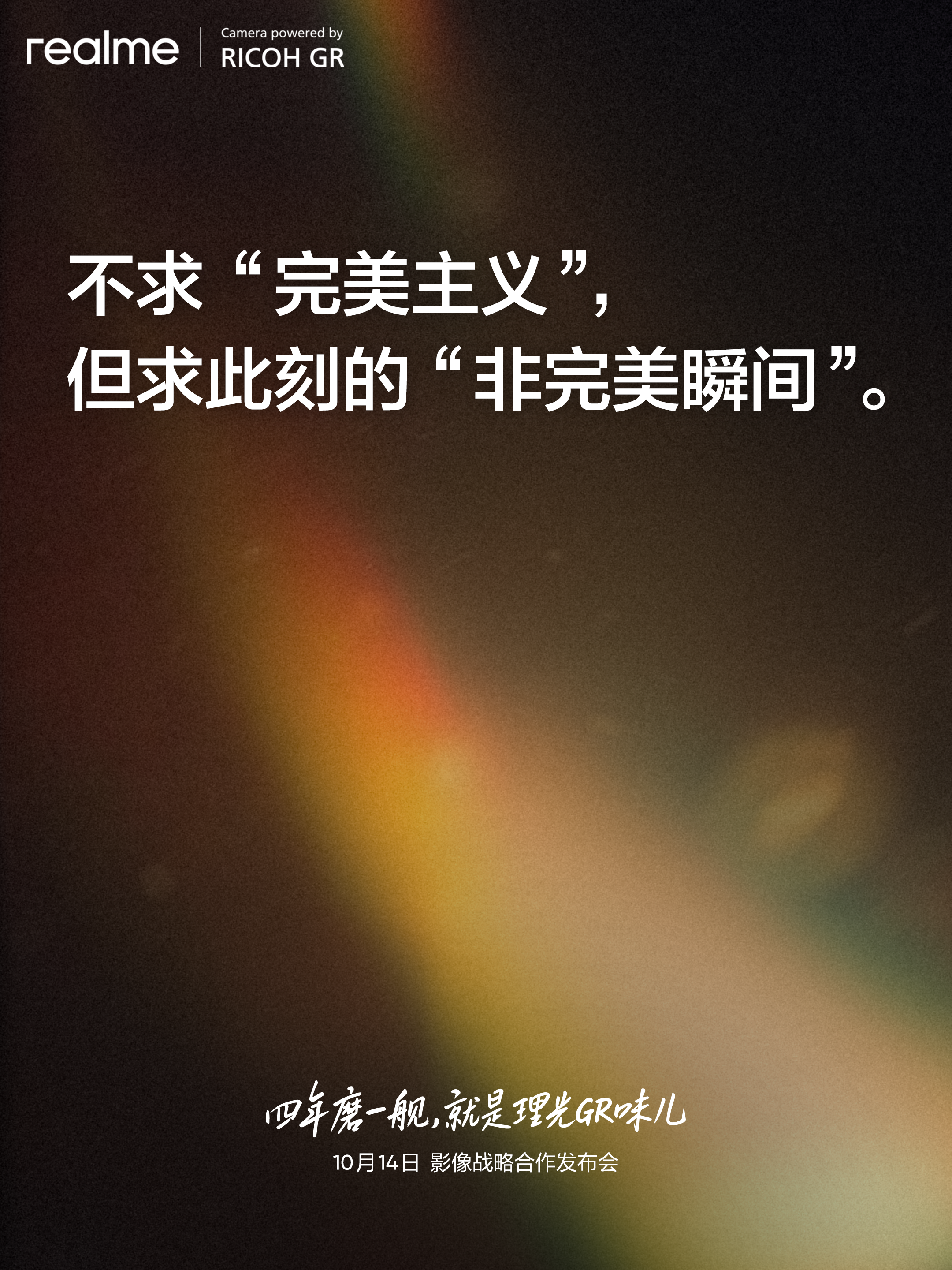 四年磨一舰,就是理光GR味儿。真我携手理光GR进行全链路的深度定制,在光学、色彩算法、成像色调以及理光GR相机的定制UI上,实现突破性的创新。这并非简单的商业联名,而是将理光GR三十年的影像积淀完整融合至真我GT8 Pro中,带来一种新鲜、年轻的照片拍摄方式。二者鼓励年轻人无需等待或试图拍出完美的照片,只需按下快门捕捉转瞬即逝的画面。更多合作细节,将于10月14日真我×理光GR影像战略合作发布会上正式揭晓。