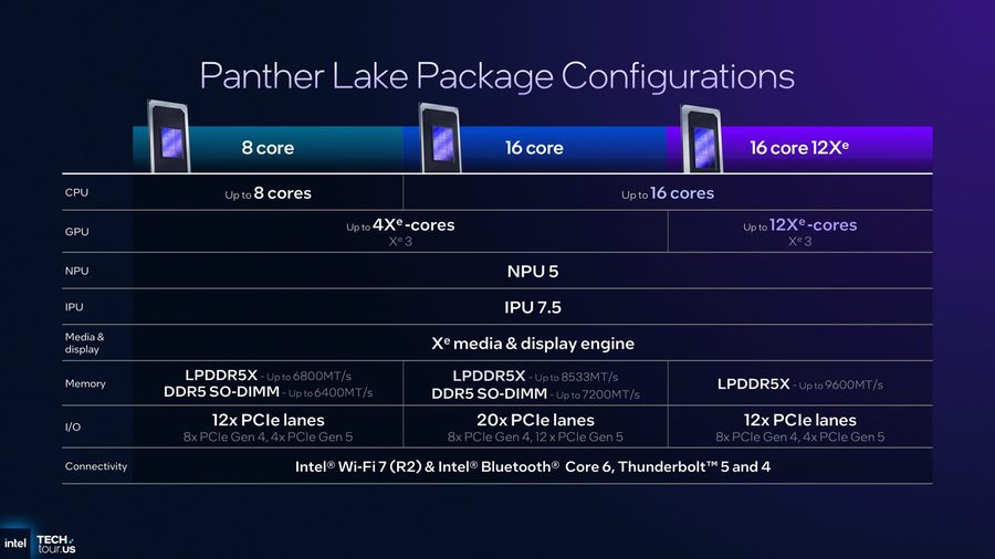 产品线规划上,Panther Lake通过三种核心配置实现了精准的市场覆盖。入门款采用8核配置,即4个性能核加4个低功耗能效核,配合4个Xe核心的核显,主打极致能效,接替Lunar Lake以及Arrow Lake-U系列在超轻薄笔记本市场的定位;中端款升级为16核配置,在4个性能核基础上增加了8个标准能效核,仍配备4个Xe核显,面向需要多线程性能且通常搭配独显的高性能笔记本和游戏本;旗舰款则采用16核加12个Xe核心的满血配置,其核显性能较Lunar Lake提升超过50%,堪称移动端最强集成显卡,专门为无独显的高端轻薄本和游戏掌机设计。
