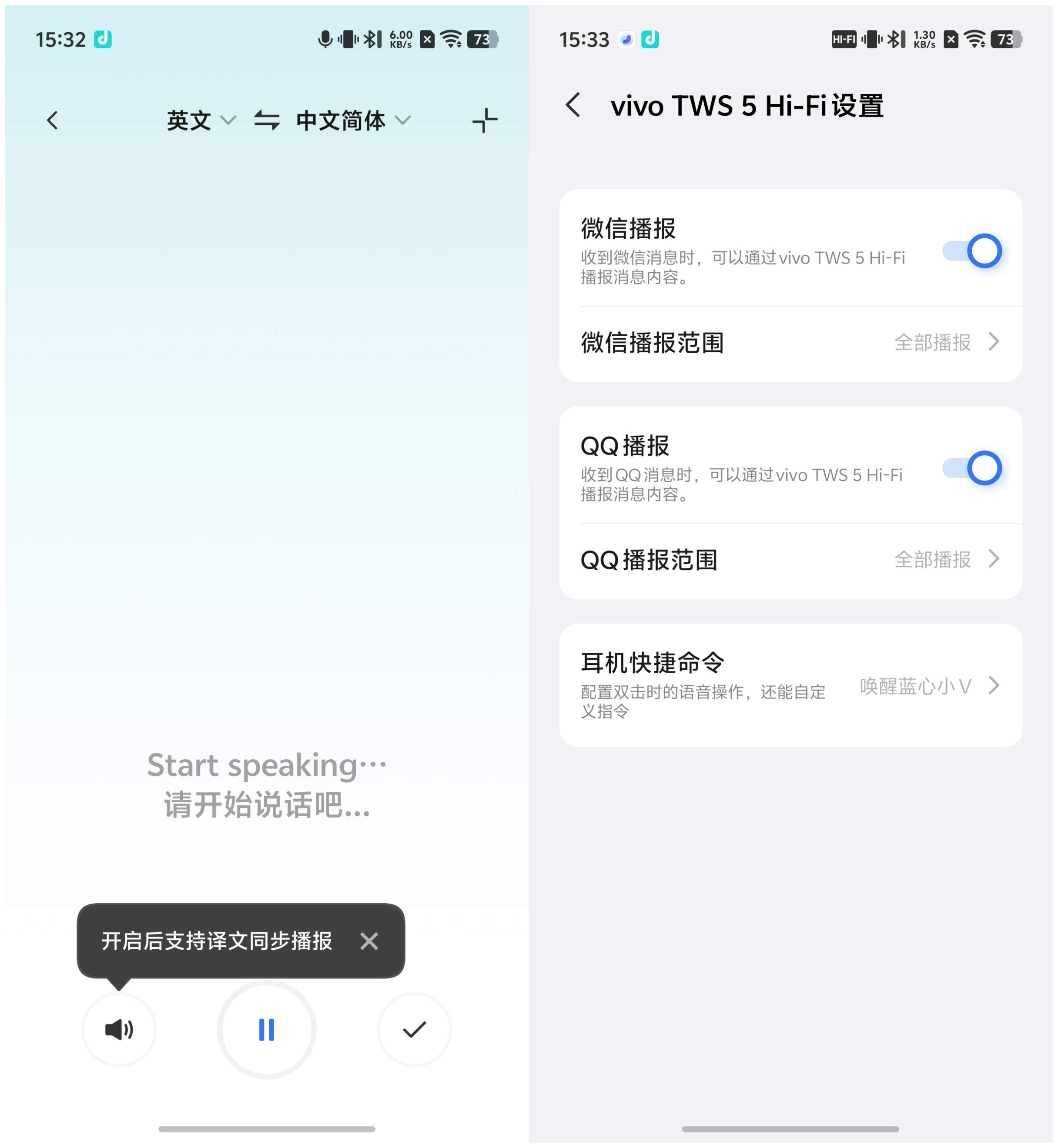 功能方面,vivo TWS 5 Hi-Fi版与vivo翻译深度打通,支持中英日韩等多语种互译,对话翻译模式如同随身翻译官,出国旅行、商务沟通毫无障碍。同时,接入蓝心小V,可语音播报通知,消息一手掌握。