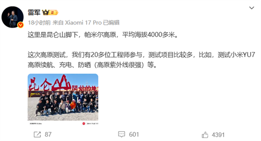 此前,小米集团副总裁张剑慧还在10月初预告“节后有新任务”,并@胡峥楠,进一步引发外界对于新车即将发布的猜测。值得一提的是,YU9内部代号传为“昆仑”,而测试地点正位于昆仑山脚下,无疑加深了这款新车的神秘感与期待值。