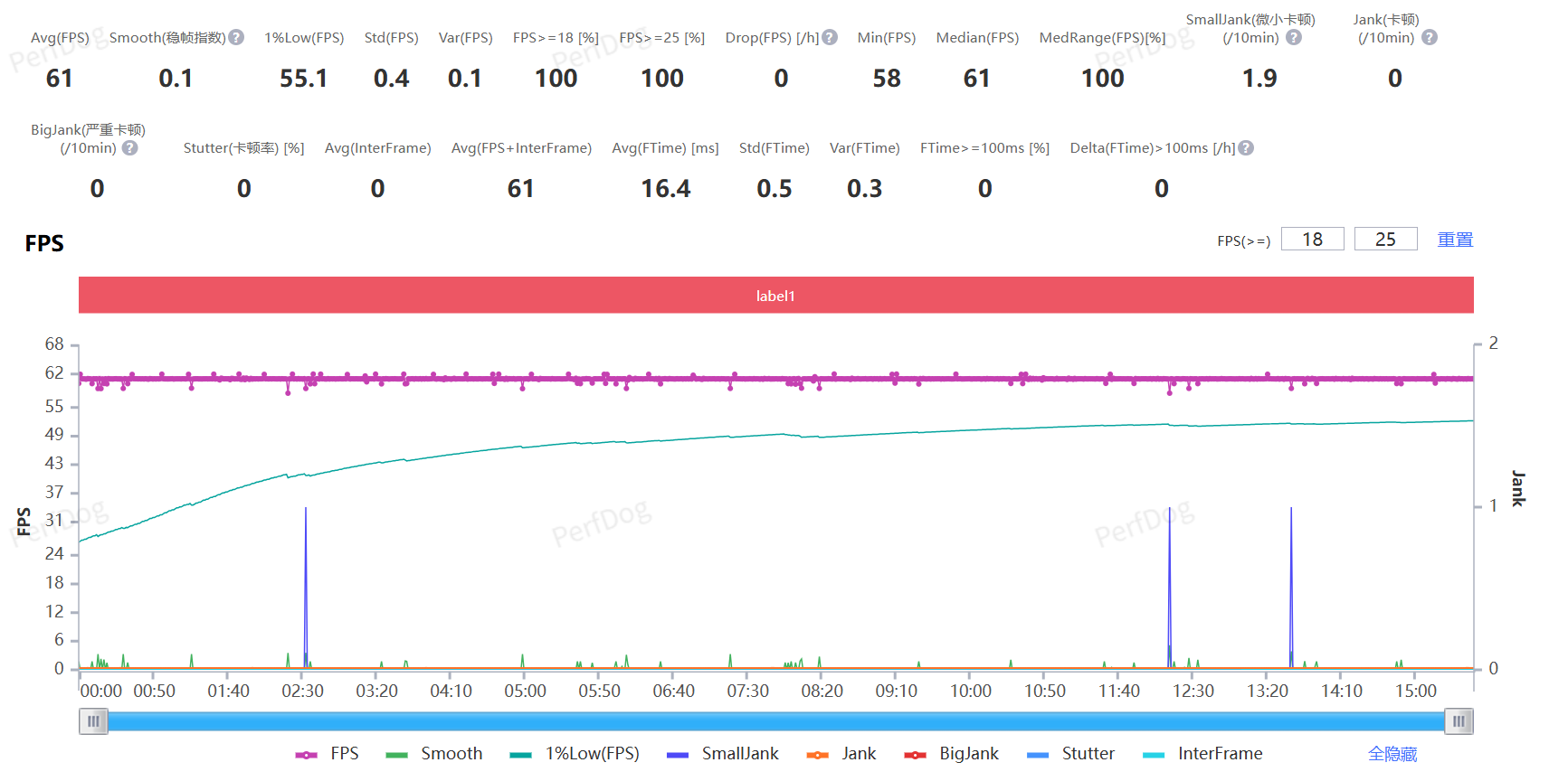 《原神》选择极高画质+60FPS,在须弥城跑图进行测试,经过PerfDog实测,平均帧率可以达到61FPS,帧率表现非常稳定。