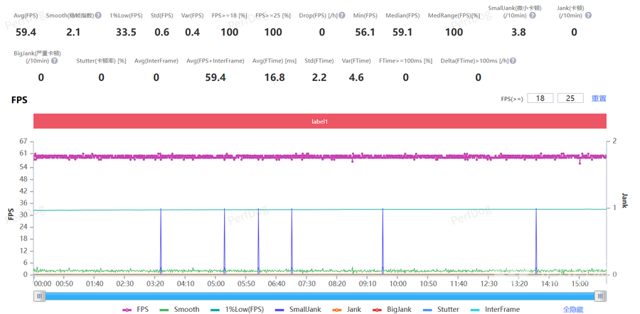 《崩坏:星穹铁道》选择最高画质+60FPS,在星槎海跑图测试,经过PerDog实测,平均帧率为59.4FPS,帧率表现同样的出色。