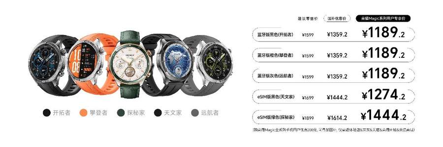 目前,荣耀手表5 Pro已开启首销,共有蓝牙和eSIM两个版本可选,其中蓝牙版本,攀登者(橙色)、开拓者(黑色)、远航者(灰色)首销国补优惠价1359.2元;eSIM版本,天文家(黑色)首销国补优惠价1444.2元,探秘家(绿色)首销国补优惠价1614.2元。首销期荣耀Magic系列用户,攀登者、开拓者、远航者专享国补优惠价1189.2元,天文家专享国补优惠价1274.2元,探秘家专享国补优惠价1444.2元。
