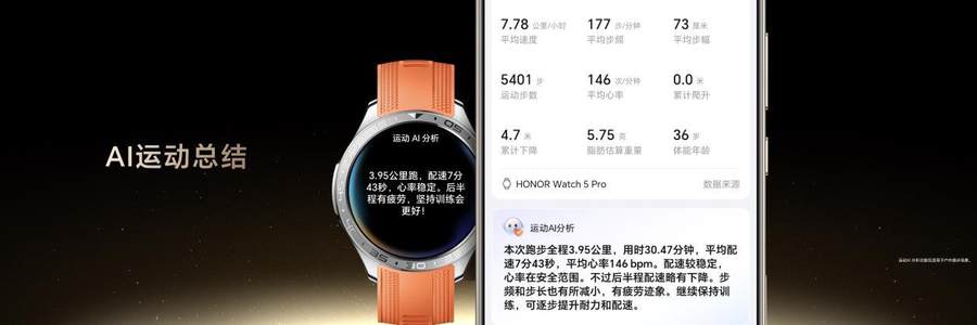 荣耀还联合北京体育大学奥运体能保障团队联合开发了AI跑步教练,将身体力量评估和大众跑者分级体系引入到产品功能之中,围绕跑步入门、健康保持和成绩提升三大目标,为不同阶段的跑者提供科学训练计划及课程。荣耀手表5 Pro还可以根据实际运动负荷监控、事物冲突、异常天气、女性生理周期、疲劳状态五大场景实时智能调整训练计划,为你打造专属的AI跑步教练。