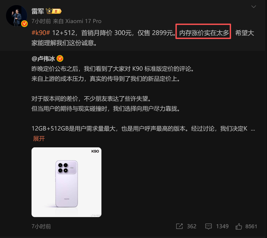 你以为只是台式机痛?手机党也别高兴太早。LPDDR5X这种旗舰内存也在猛涨,就拿刚发布的REDMI K90来说,虽然刚发布首销就价降了300块,但这其实是小米“咬牙补贴”换来的。雷军亲自下场发微博表示:“最近内存涨得实在太多,希望大家理解我们的诚意。”