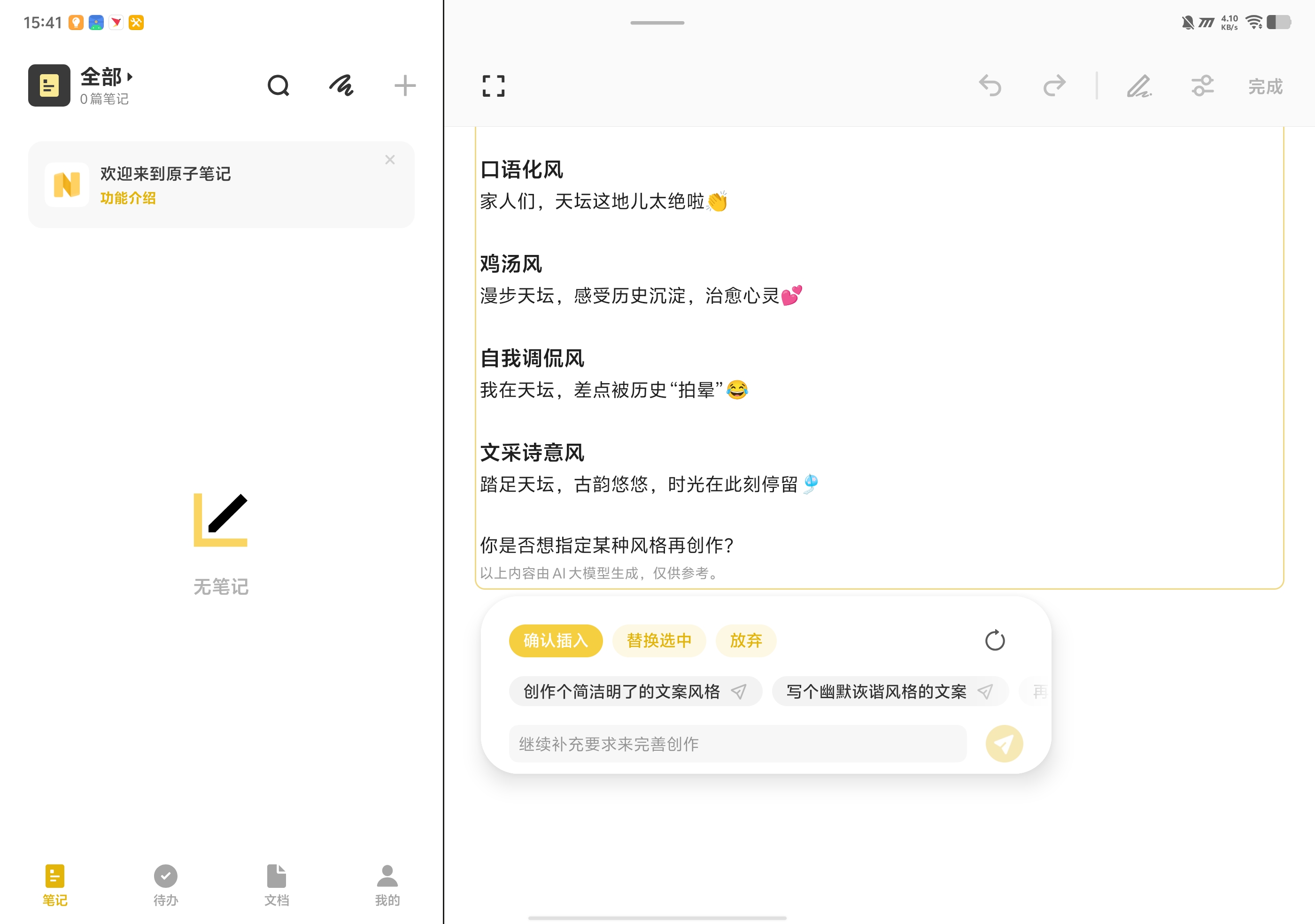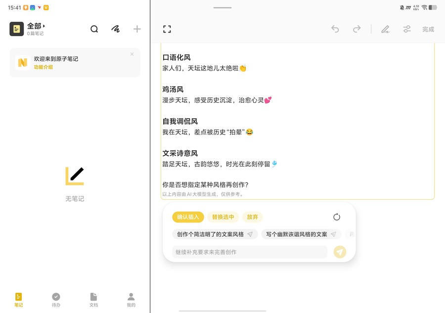蓝心小V的深度植入为用户带来了丰富的AI体验,小V写作功能支持多文体创作,无论是简历、演讲稿还是购物评价,都能一键生成并进行润色、扩写等处理,在vivo文档与输入法中均可便捷调用。