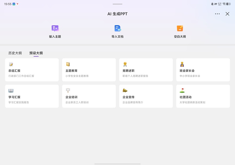 AI PPT助手更是堪称效率神器,只需输入主题或上传文档,即可自动生成精美PPT,支持大纲修改与模板选择,为学生答辩与职场演示提供了极大便利。