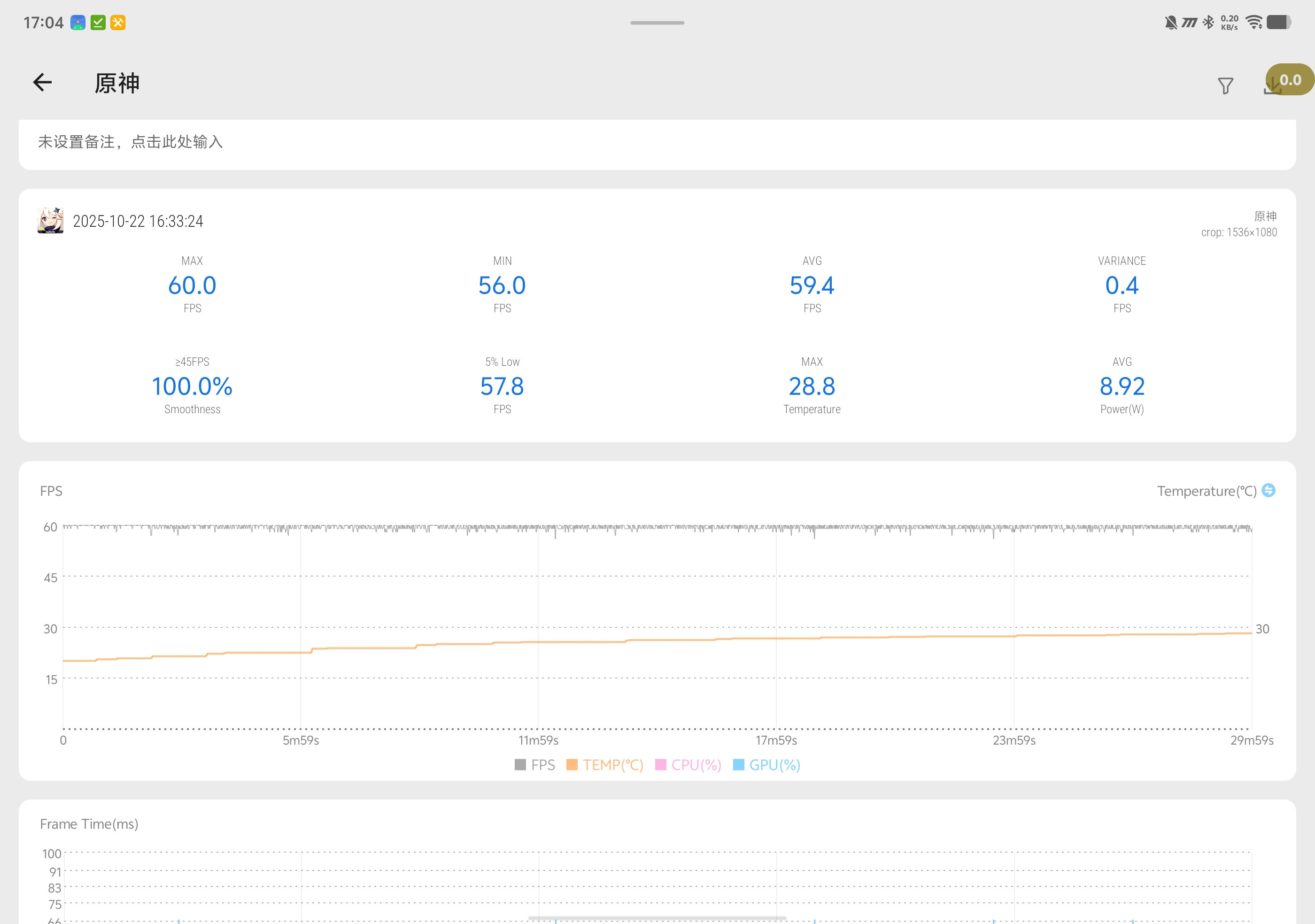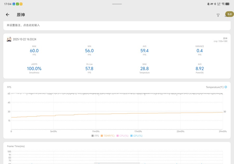 《原神》画质特效拉满,30分钟跑图测试后平均帧率为59.4FPS,整体表现相当流畅,开启超分后也能呈现出超越原生画质的清晰细节。