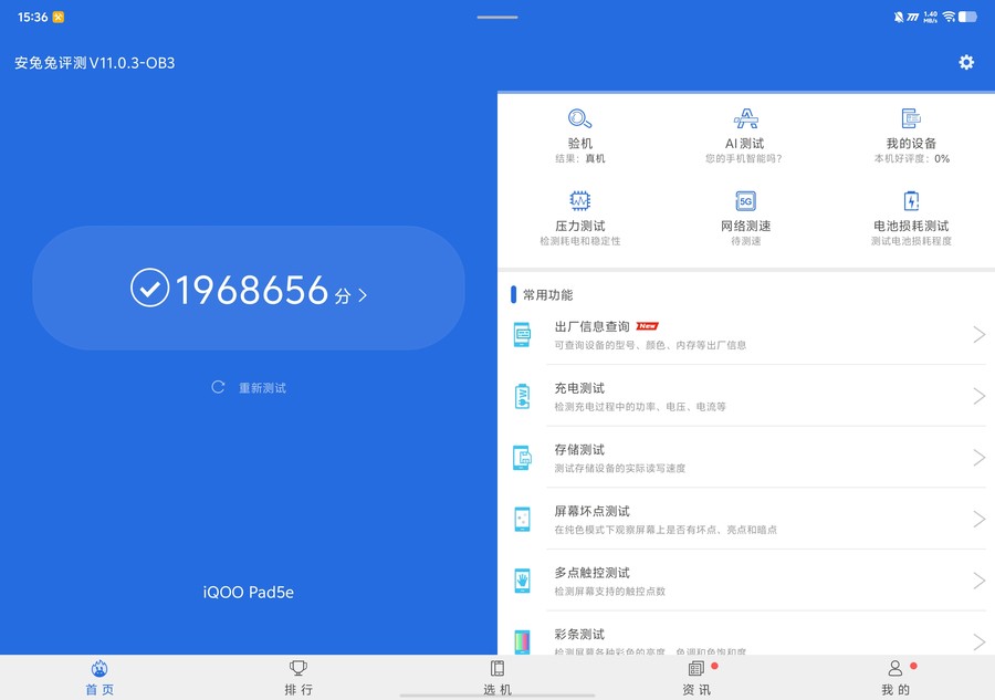 在安兔兔V10版本测试中,我们这台iQOO Pad5e跑出1968656的综合跑分,足以证明其在同档位产品中的性能领先地位。