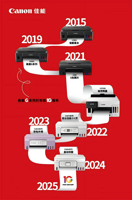 十年来,佳能G系列紧扣中国个人用户和行业用户需求变化的脉搏,实现产品和功能持续迭代与拓展。回顾佳能G系列十年演进之路:2015年,佳能针对中国消费者对低成本、大印量的打印需求,推出首批三款G系列加墨式高容量打印机:G1800、G2800、G3800;2019年,顺应中国柜机市场蓬勃发展的趋势,佳能发布了高速G系列,满足企业办公及行业用户需求;2021年,佳能聚焦摄影爱好者,推出了大印量的6色加墨式照片打印解决方案G580和G680;2022年,佳能针对商务用户对于高速、低粉尘的环保诉求,推出了高速打印机GX系列(即恭喜系列);2023年,佳能面向家庭用户及不同圈层人群,推出了4款彩色外形的G系列产品,以其实惠的价格和多彩的选择,引起市场关注;2024年,佳能围绕中国现代家庭和办公人群多样化的需求,推出了自动双面G系列打印机,带来省时、省力、省心的打印体验。