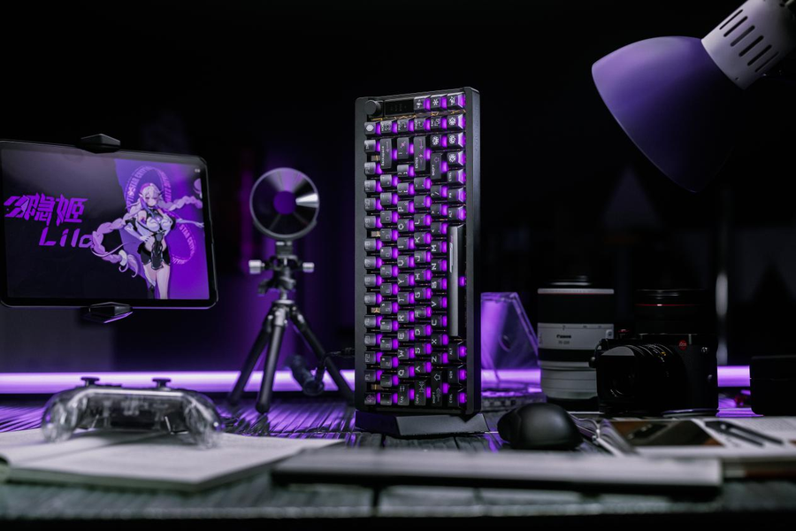与之匹配的键帽方面,巅峰版采用五面热升华PBT+PC键帽、IP客制化造型,耐磨抗打油;标准版则为PC雾透键帽,光影朦胧,字符清晰,键盘正面与底部双侧配备1680万色RGB灯带,支持23种灯效模式与音乐律动。集成OLED显示屏实时展示键盘状态与系统信息,无时无刻都在强化专业的游戏竞技属性。