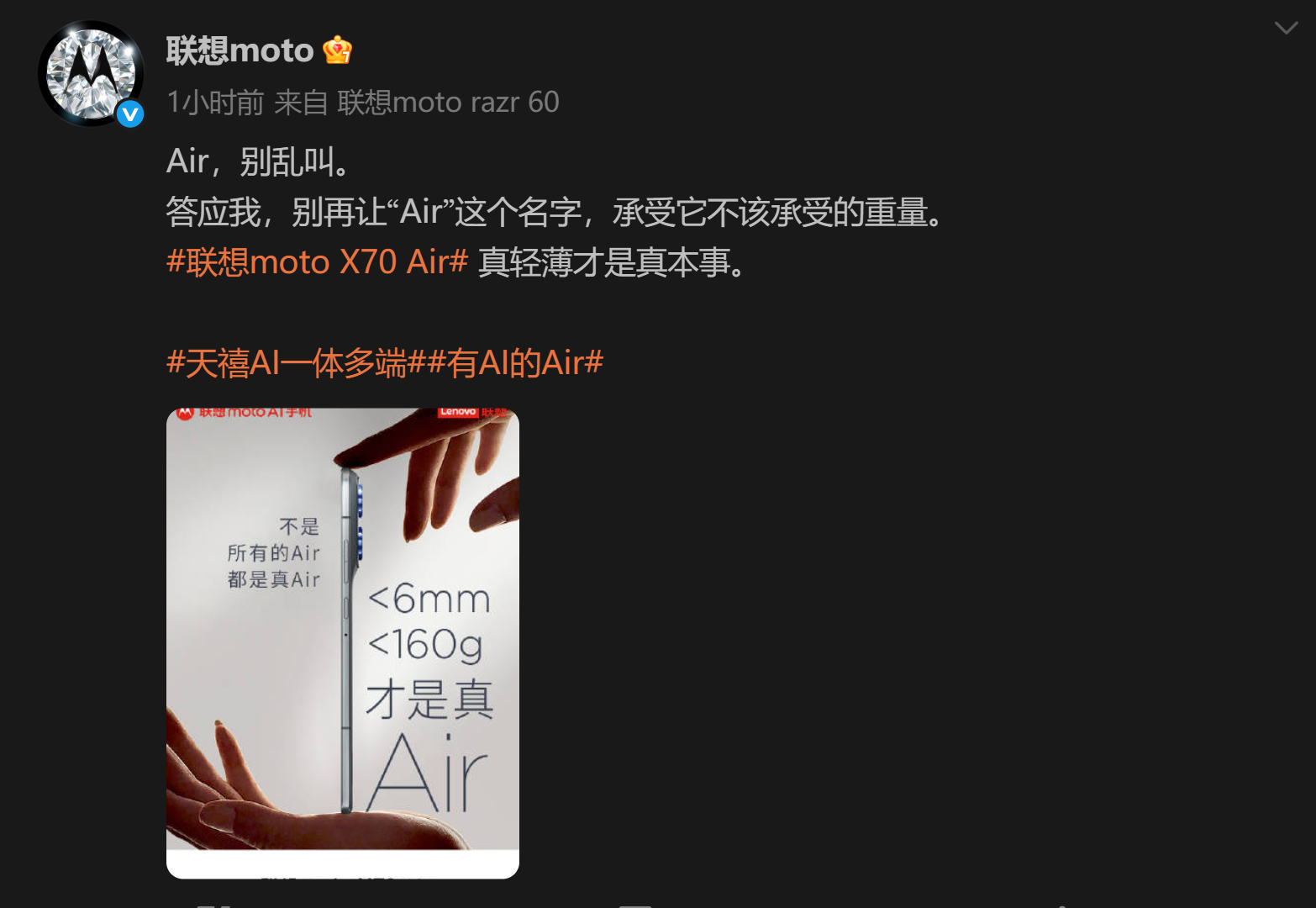 而联想moto官方今日在微博上发文称:“Air,别乱叫。”并直言,只有像moto X70 Air这样的超薄机型才配得上“Air”这一名称。官方还特别指出,moto X70 Air的厚度不到6mm,重量不到160g,才是真正的“Air”。