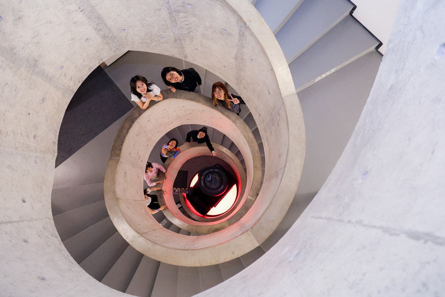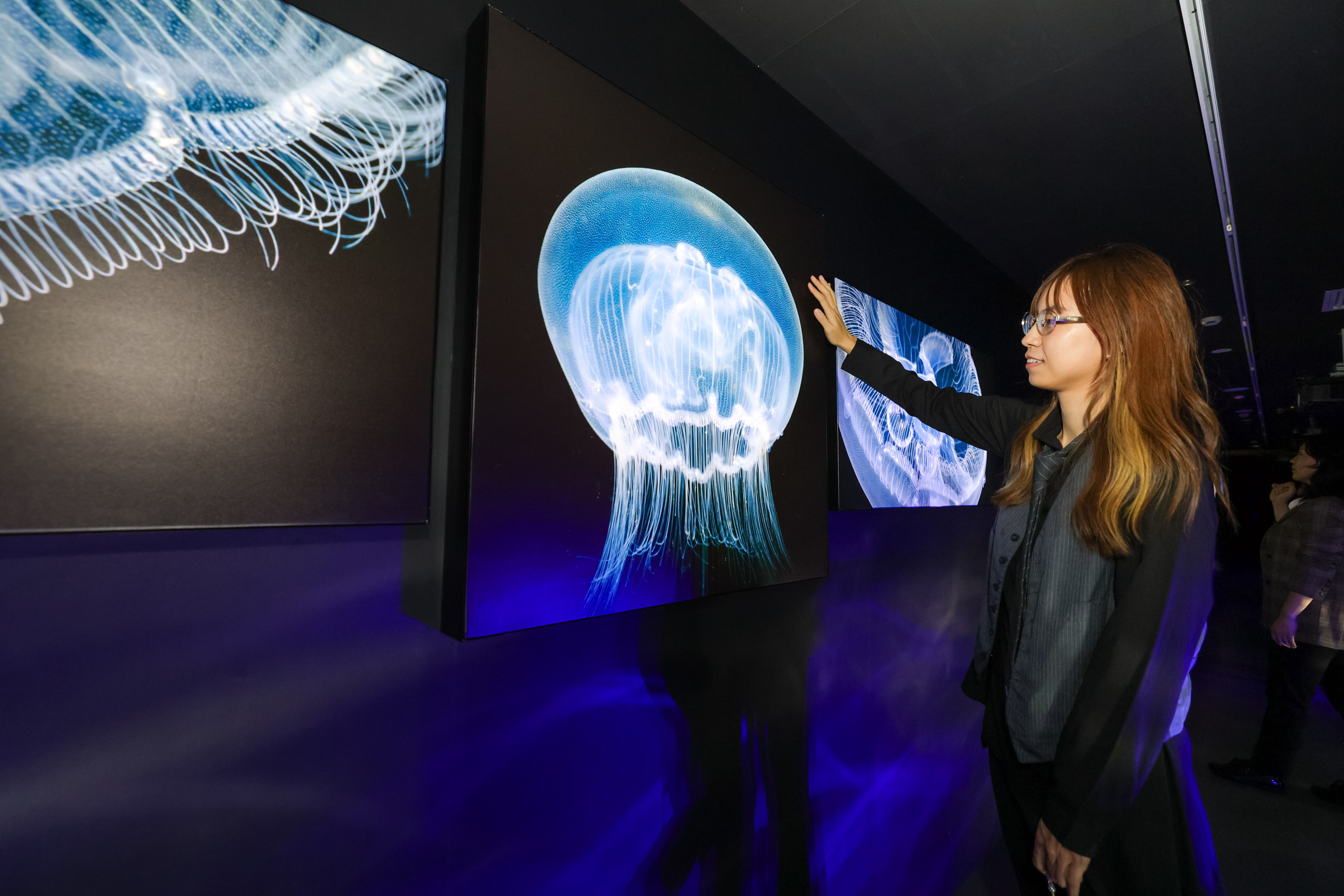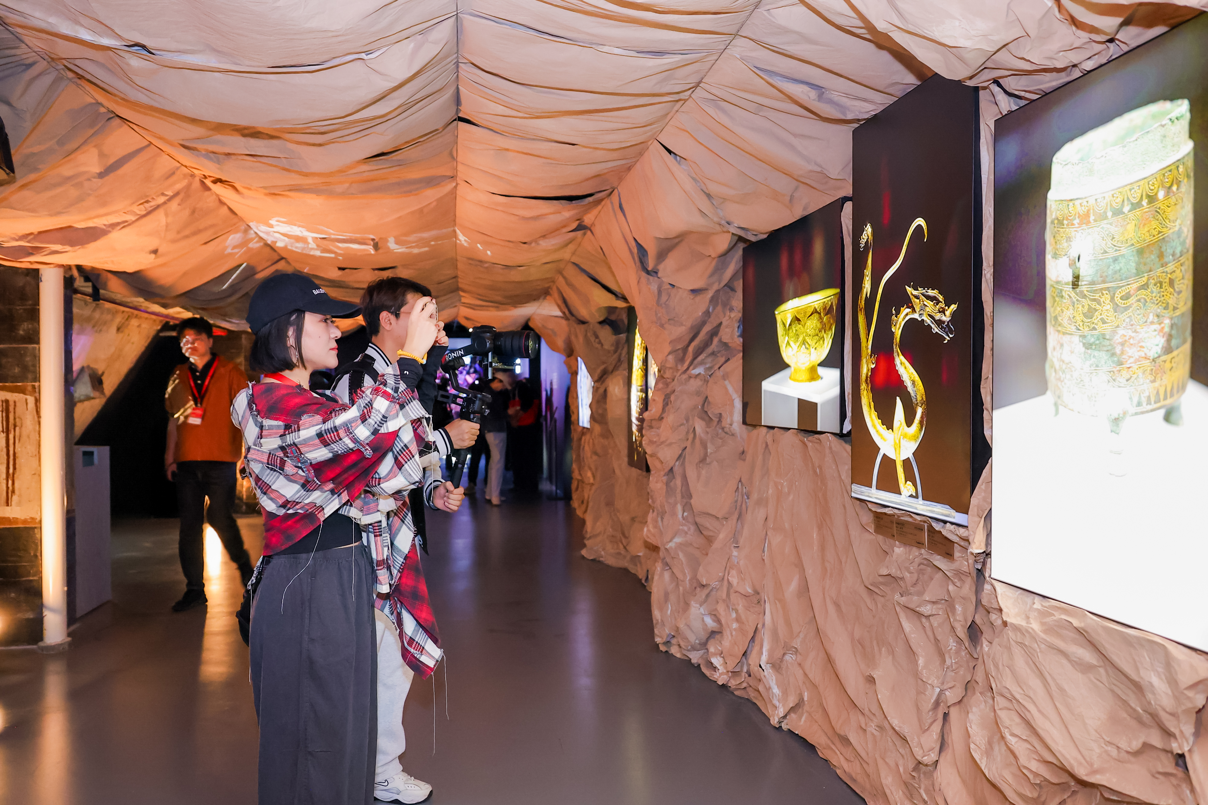 整个展览共设置三层展区。一层为影像艺术互动区,通过光影与影像的结合,为影像作品增添灵动和强烈的视觉呈现。二层是“文化遗产石窟”和“深海秘境”沉浸式观展体验区,“文化遗产石窟”的展区设计用纸艺重现了石窟场景,现场展示如唐代鎏金铁芯铜龙、商代戴金面罩青铜人头像等文物摄影作品,并通过投影的方式呈现,让参观者在虚实交错中完成一场跨越时空的文化对话;而在“深海秘境”体验区,借助光影技术,观众仿佛置身于神秘的海底世界,与水下生物进行一场亲密的对话。四层的展览内容则更加丰富,实景搭建的艺术风格花园美轮美奂,成为参观者争相打卡的梦幻背景;多面镜射的深空和沉浸式投影打造的极光海滩让人沉浸于“星穹咏叹”的视觉洗礼;更有那被大气中的尘埃粒子反散射形成的淡粉色光弧,这个反曙暮光也叫“维纳斯带",灰蓝的色带就是地球的影子。气膜材质灵感源于在观测时感受到的“天空的呼吸”,把无形的空气实体化。观众看到的不只是“固体”,也像空气在光中的显影。这标志了维纳斯带的生命性:轻盈、流动、随时间消散。球体仿佛在呼吸,回应着人类与大气之间最基本的连接,为到场的每一位观众献上一场真实可感的天文奇景。