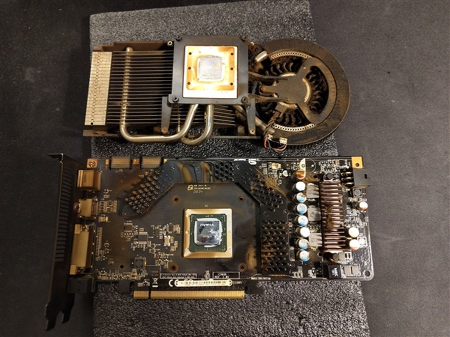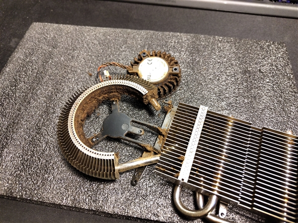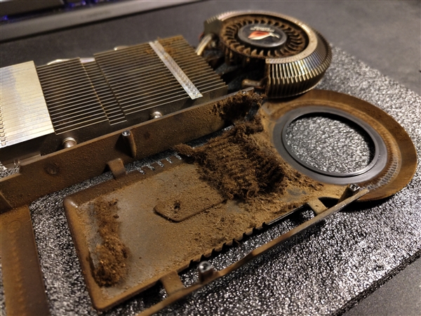 这款华硕ROG Matrix 9800 GT显卡于2008年上市,原本是面向发烧友的高端中端显卡。然而,经过17年的长时间使用且没有得到任何维护,显卡的散热片完全被污垢堵塞,显卡外观看起来相对干净,但拆开后,散热片几乎所有表面都被灰尘和污垢覆盖,特别是在散热罩下方的堆积更为严重。Madness727甚至开玩笑地说,面对这堆污垢,他都不敢轻易吹气,害怕自己也会被这些有害物质感染。