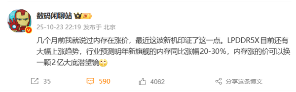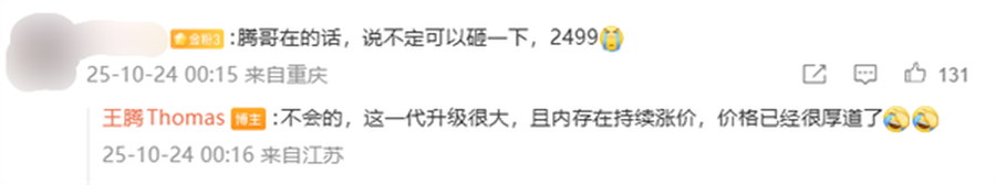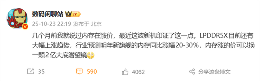 就连REDMI前产品经理王腾调侃道:以后REDMI手机不会再砸价了,这次K90升级太大,而且内存疯涨,现在的定价已经很厚道。明年旗舰机还会更贵?多半跑不了,因为LPDDR5X涨价趋势明确,行业预测明年同比涨20-30%。