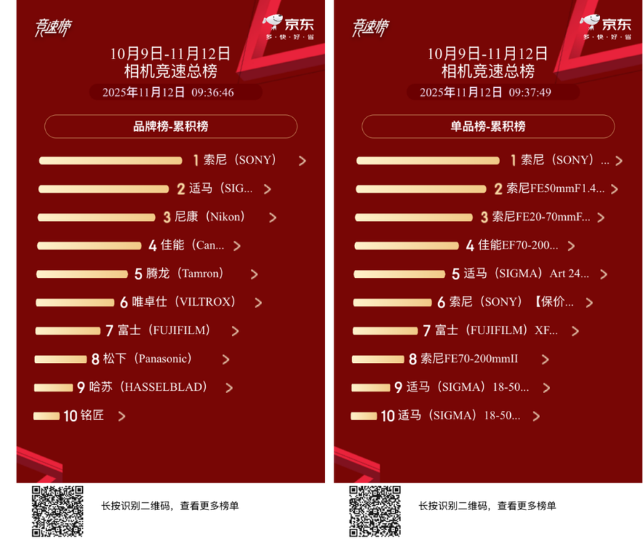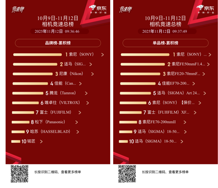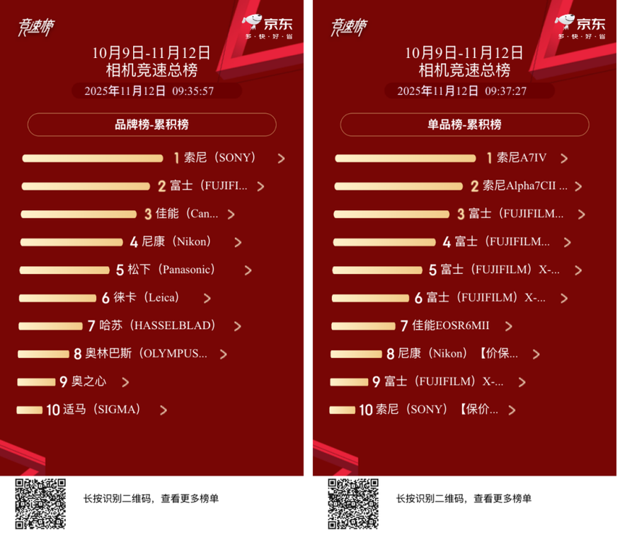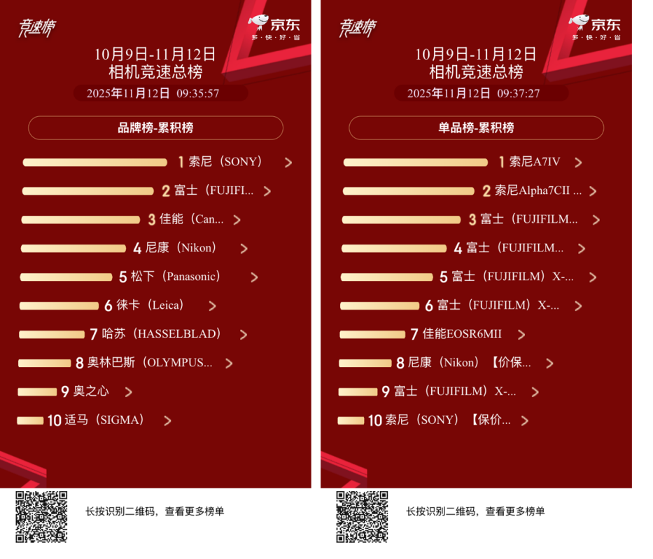 此次 “双登顶” 不仅印证了索尼影像的持续竞争力与技术领先优势,更直观反映出广大消费者与创作者对其品牌价值、产品品质及技术创新的高度认可。从 618 到双 11,索尼影像全年两大促持续领跑,稳稳奠定了 2025 年在京东数码影像领域的领先地位。